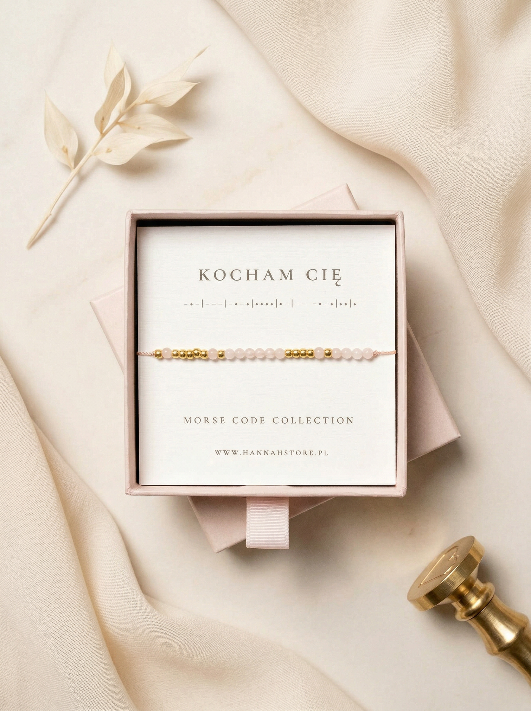 KOCHAM CIĘ – bransoletka z kwarcem różowym zakodowana Alfabetem Morse’a