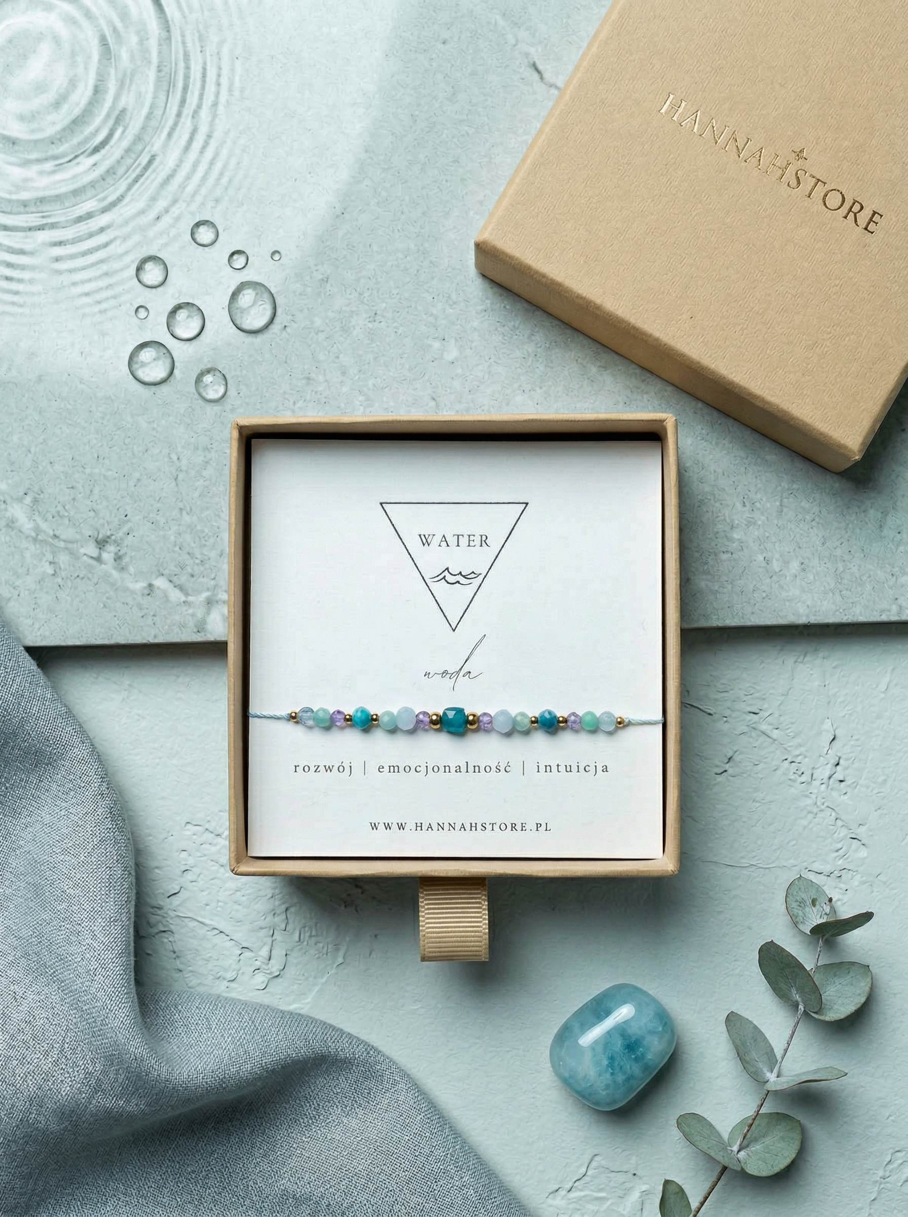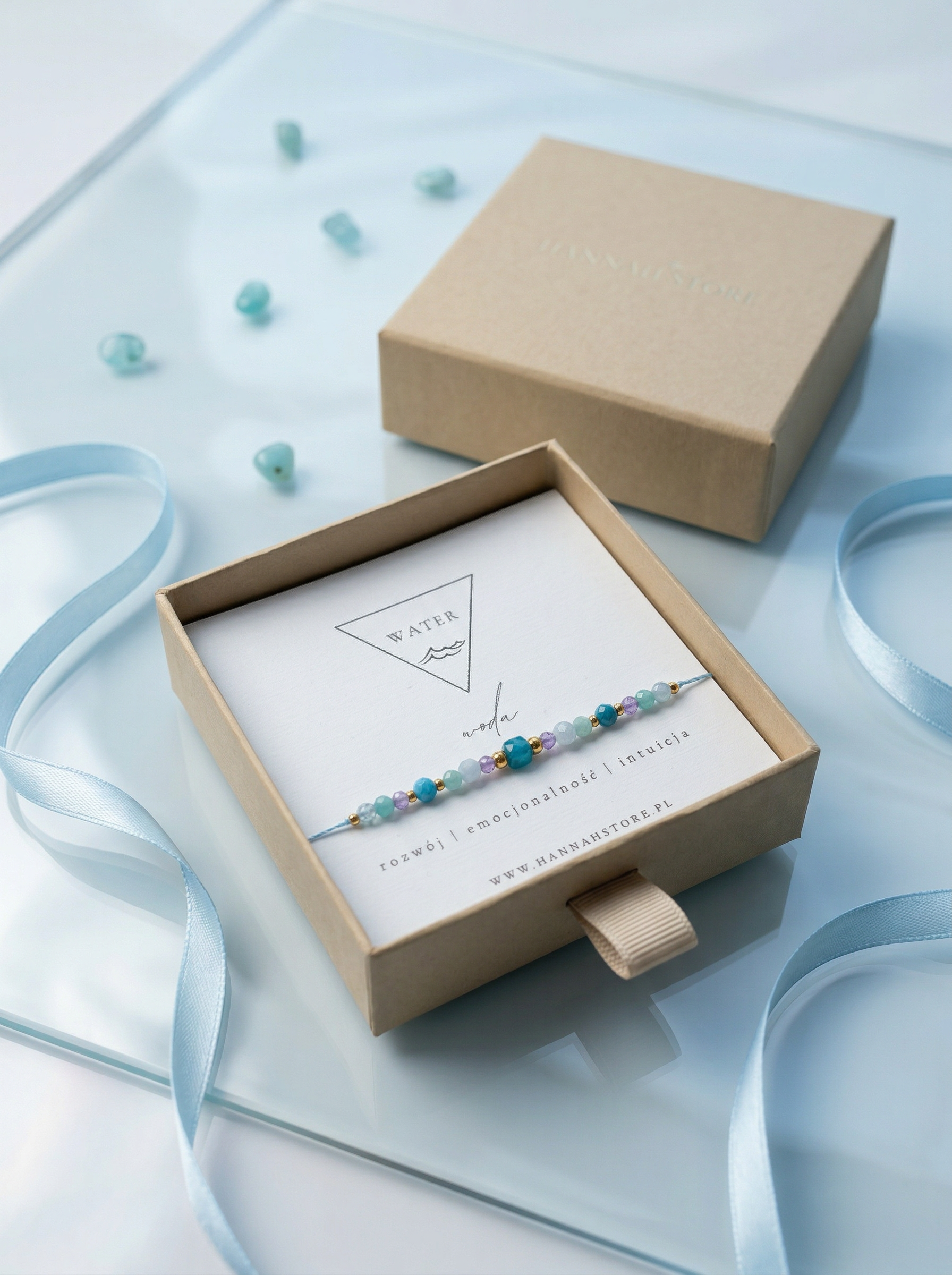 Ta bransoletka nie tylko ozdobi Twoje nadgarstki, ale także przyniesie Ci spokój, klarowność i oczyszczenie, jakie daje Woda.