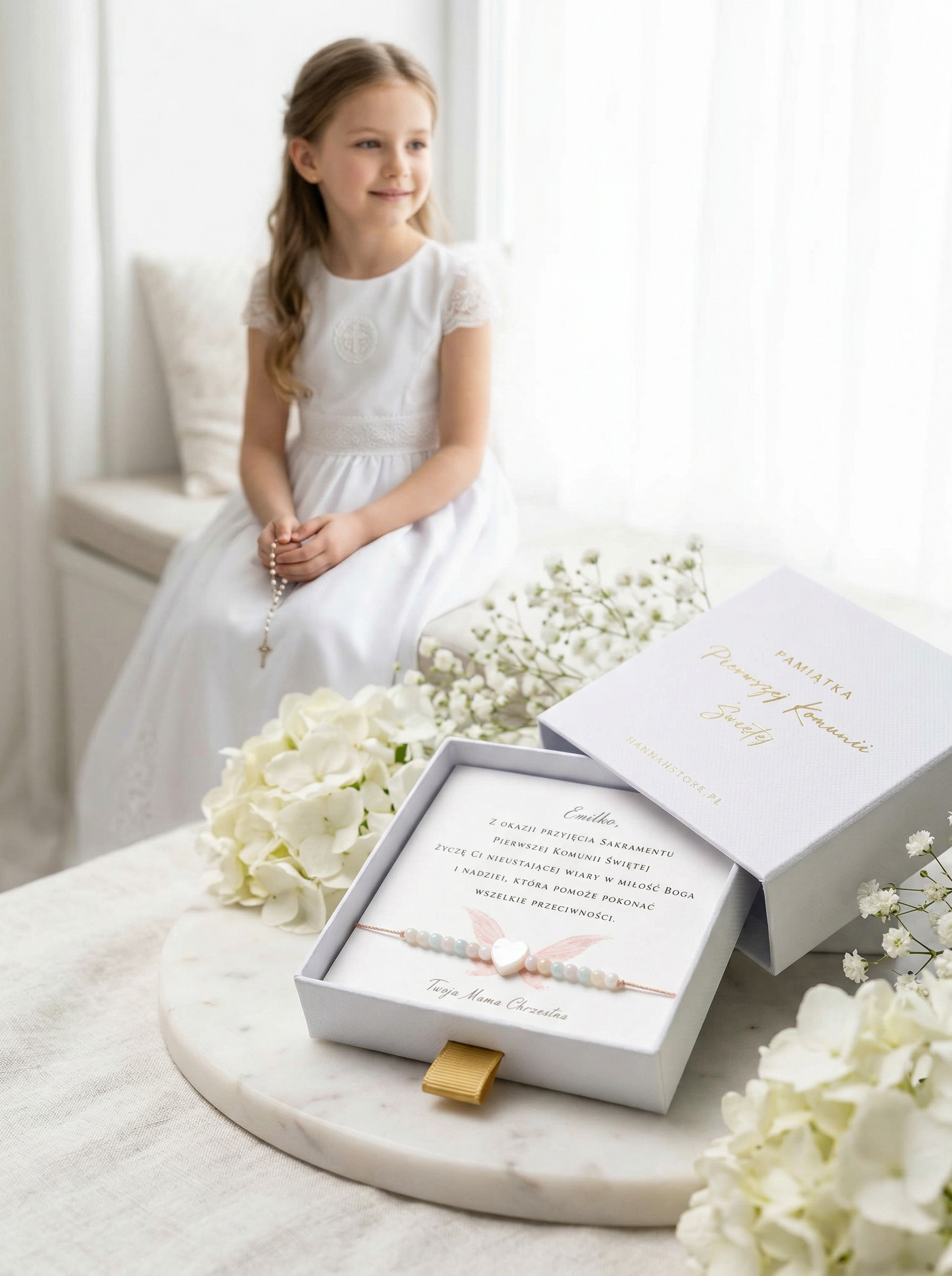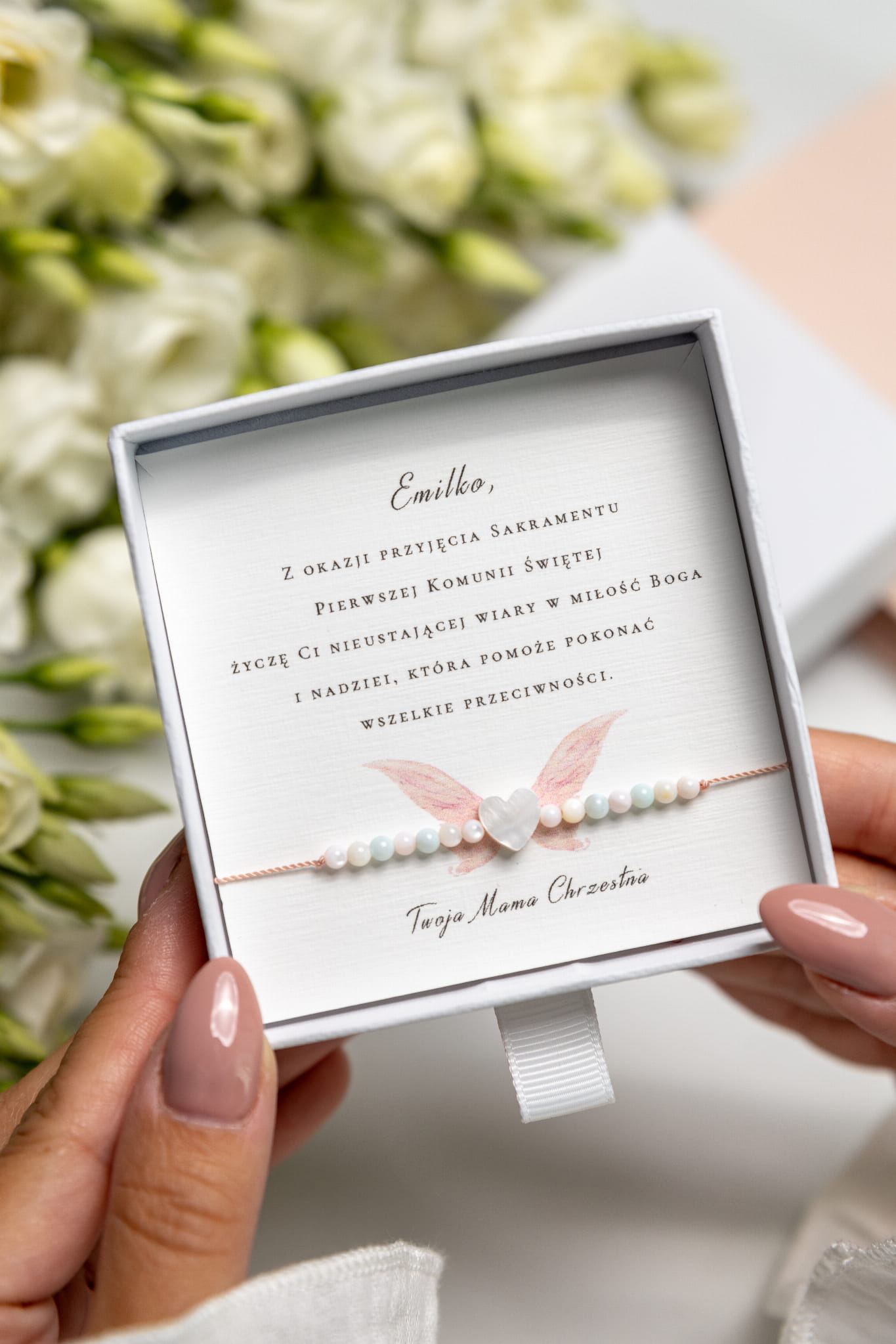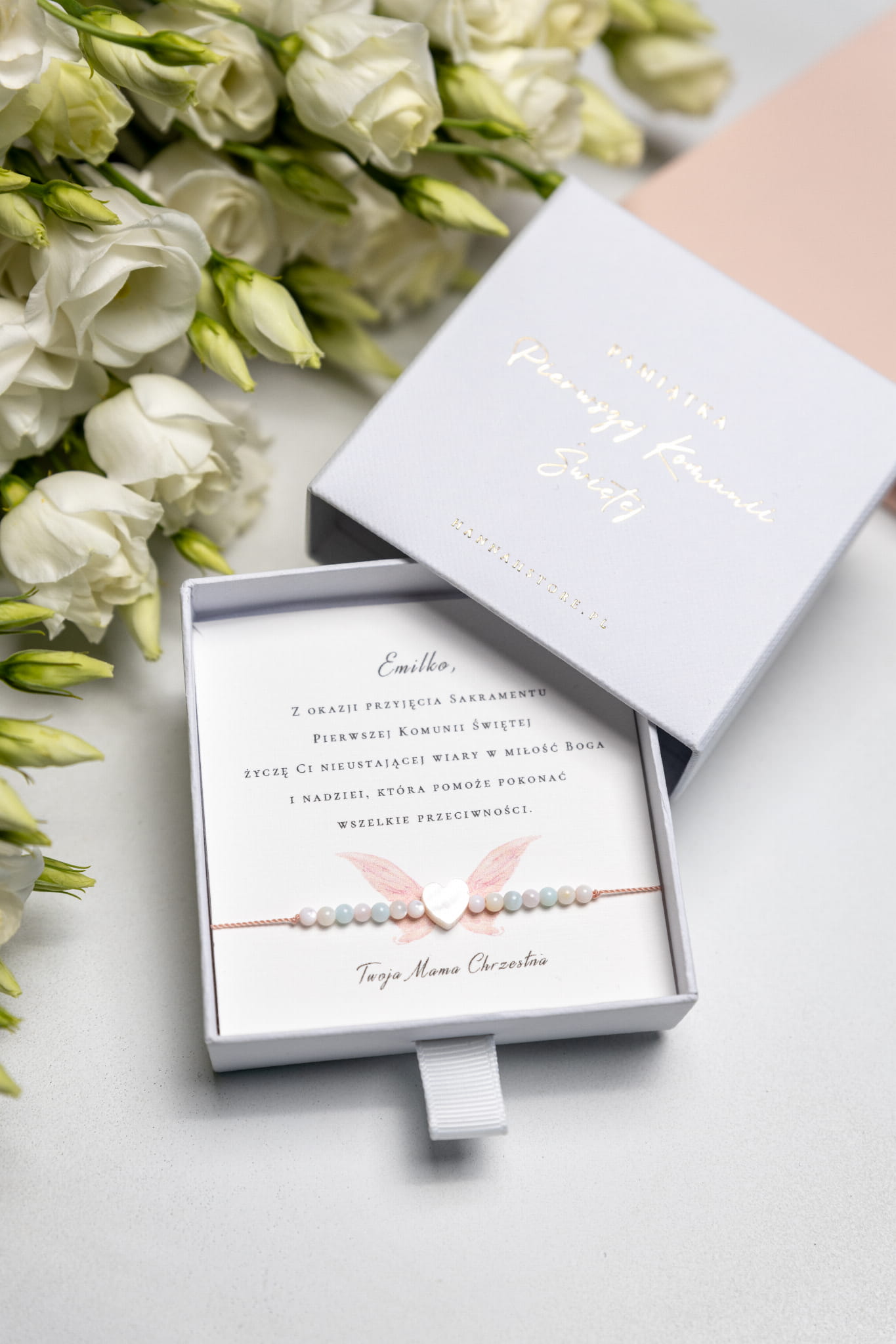 Do bransoletki można dobrać również pudełeczko magnetyczne ( różowe lub białe) z możliwością naniesienia imienia dziecka na jego zewnętrzną stronę, bądź torebki prezentowej.