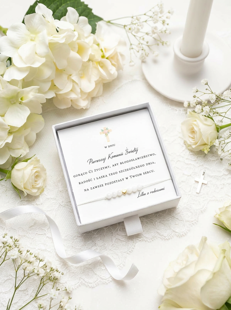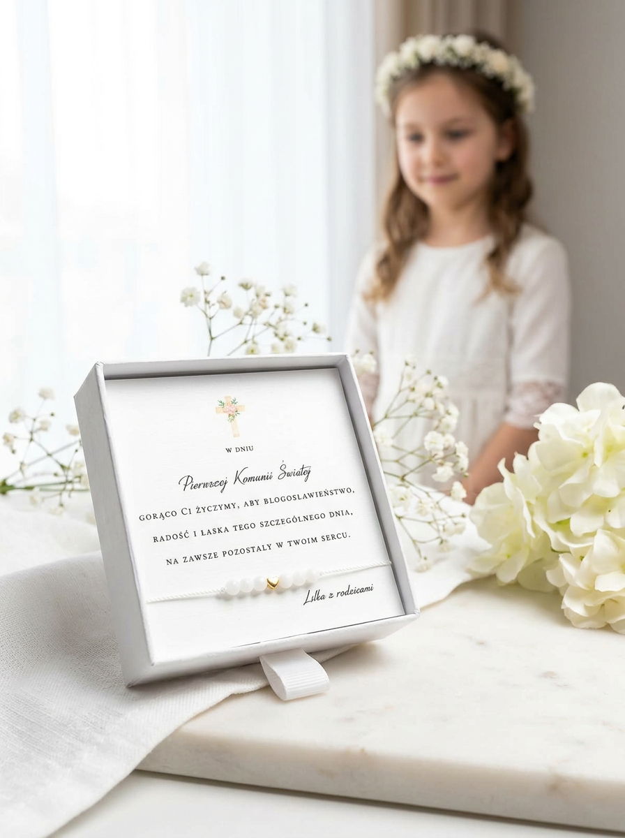 PURE LOVE to delikatna bransoletka dla dziewczynek, stworzona jako symbol bezwarunkowej miłości. Wykonana z pozłacanego srebra próby 925, naturalnego kamienia księżycowego i subtelnej nici nylonowej – stanowi elegancki i pełen znaczenia dodatek na wyjątkowe okazje, takie jak Komunia Święta czy urodziny.