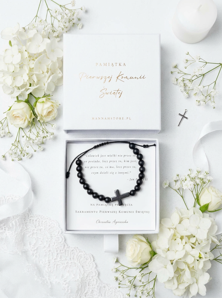 Bransoletka COMMUNION CROSS to elegancka propozycja dla chłopców, wykonana z matowego onyksu, hematytu oraz czarnej, trwałej nici nylonowej. Symboliczny krzyżyk nadaje jej duchowego znaczenia, czyniąc ją idealnym prezentem na Pierwszą Komunię Świętą, urodziny lub inną wyjątkową okazję. Prosty, a zarazem ponadczasowy design sprawdzi się zarówno na co dzień, jak i podczas ważnych uroczystości.
