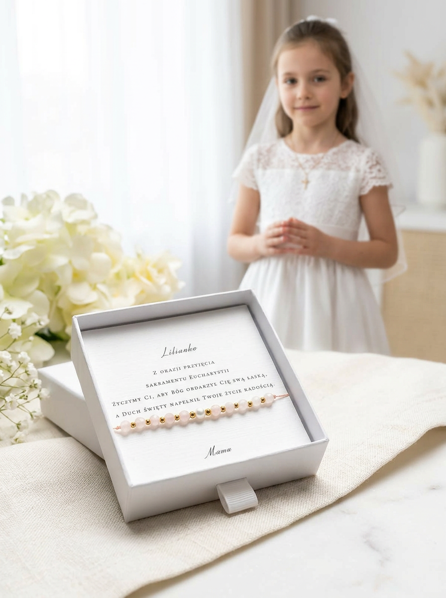 COMMUNION ROSARY Pink Pearl to dziewczęca bransoletka z naturalnego kwarcu różowego, ozdobiona delikatną perełką seashell. Idealna jako prezent z okazji Pierwszej Komunii Świętej, urodzin lub po prostu – jako wyjątkowy dodatek do codziennych stylizacji.