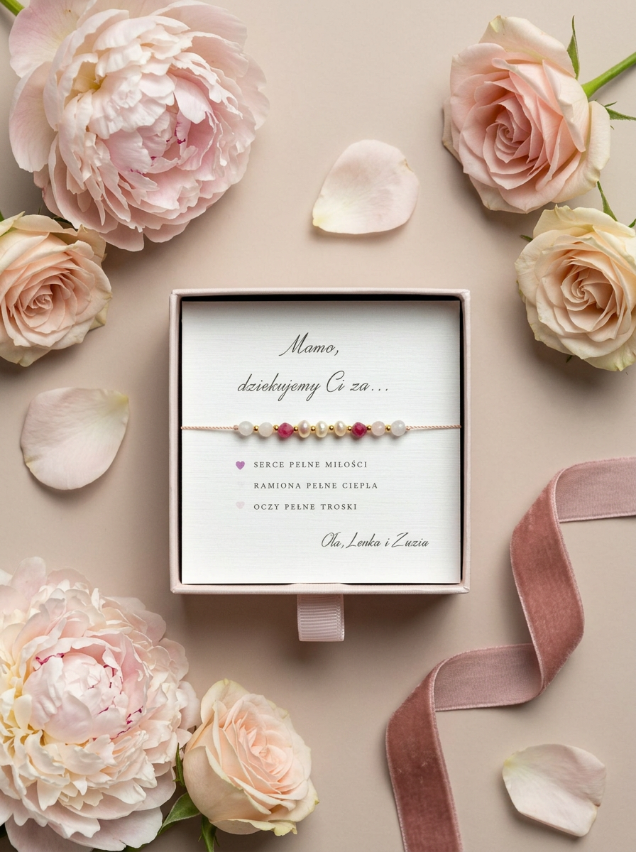 Delikatna bransoletka symboliczna dla mamy – zaprojektowana i ręcznie wykonana w naszej pracowni – to wyjątkowa propozycja, stworzona z naturalnych kamieni symbolizujących miłość i wdzięczność oraz z drobnych naturalnych perełek, które mogą symbolizować liczbę dzieci.