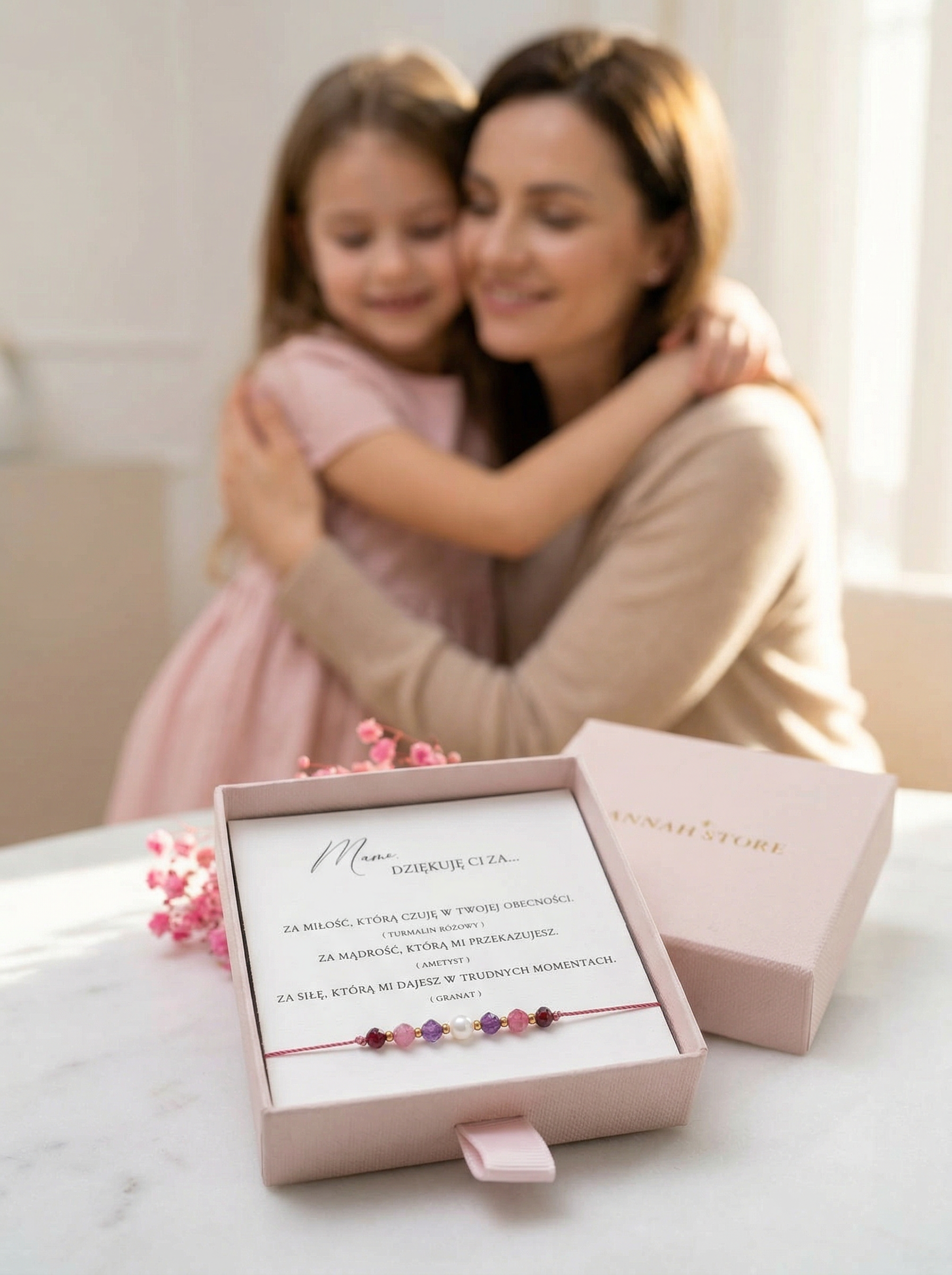 Bransoletka symboliczna dla MAMY z perełką naturalną - turmalin różowy, ametyst, granat