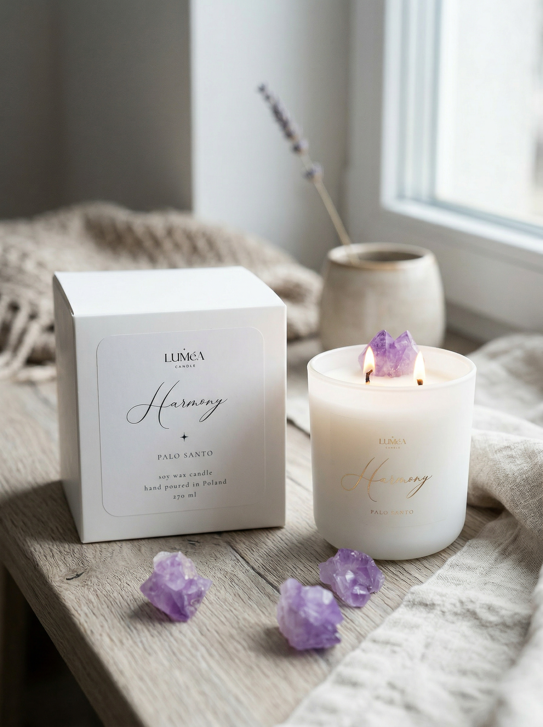 Ręcznie tworzona w Polsce, świeca Light of HARMONY łączy energię ametystu, naturalny wosk sojowy i otulający aromat, tworząc wyjątkowy rytuał równowagi.