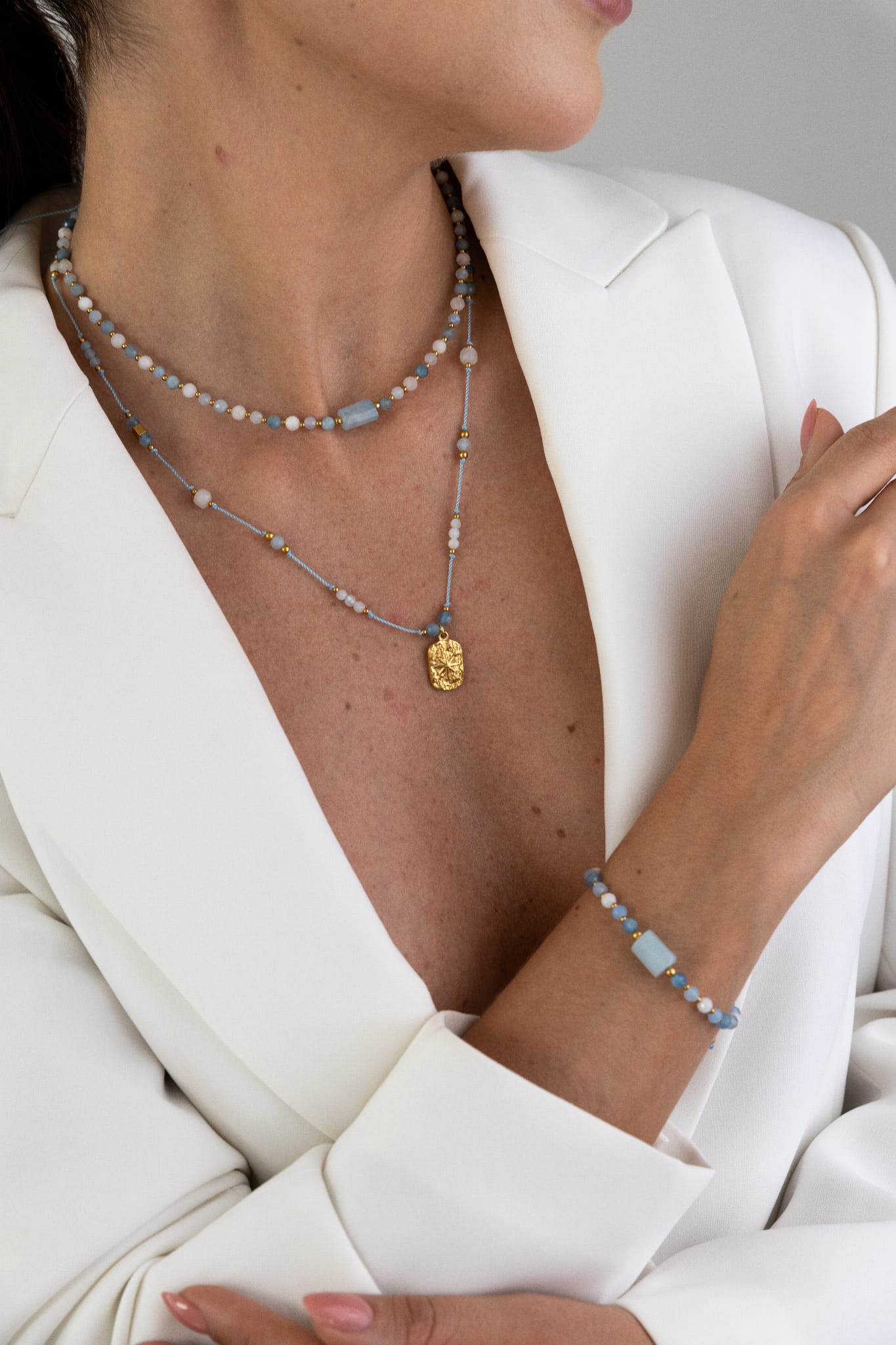 Naszyjnik na nici AMULET intuicji i spokoju - akwamaryn jasny, akwamaryn ciemny, kamień księżycowy
