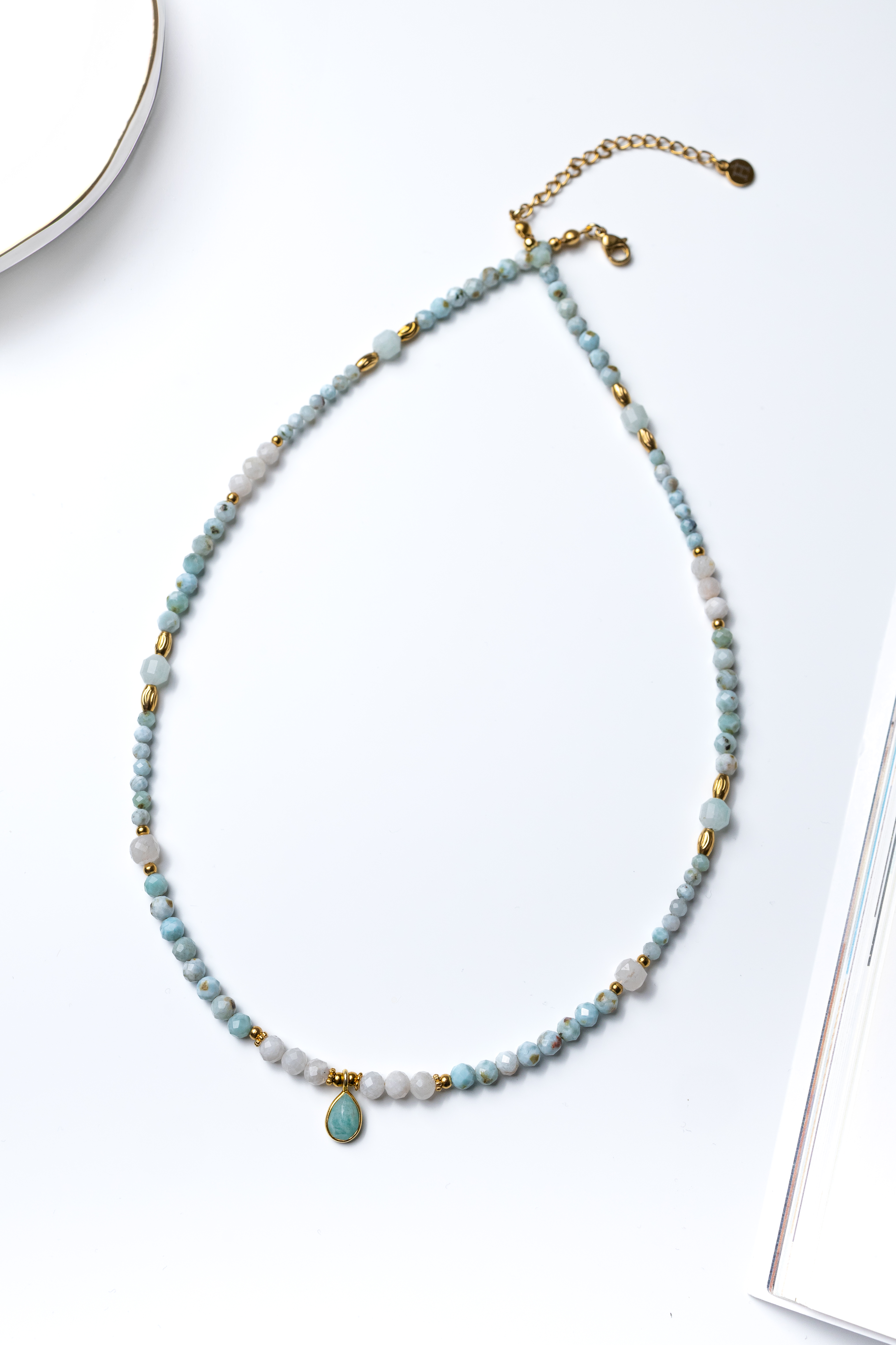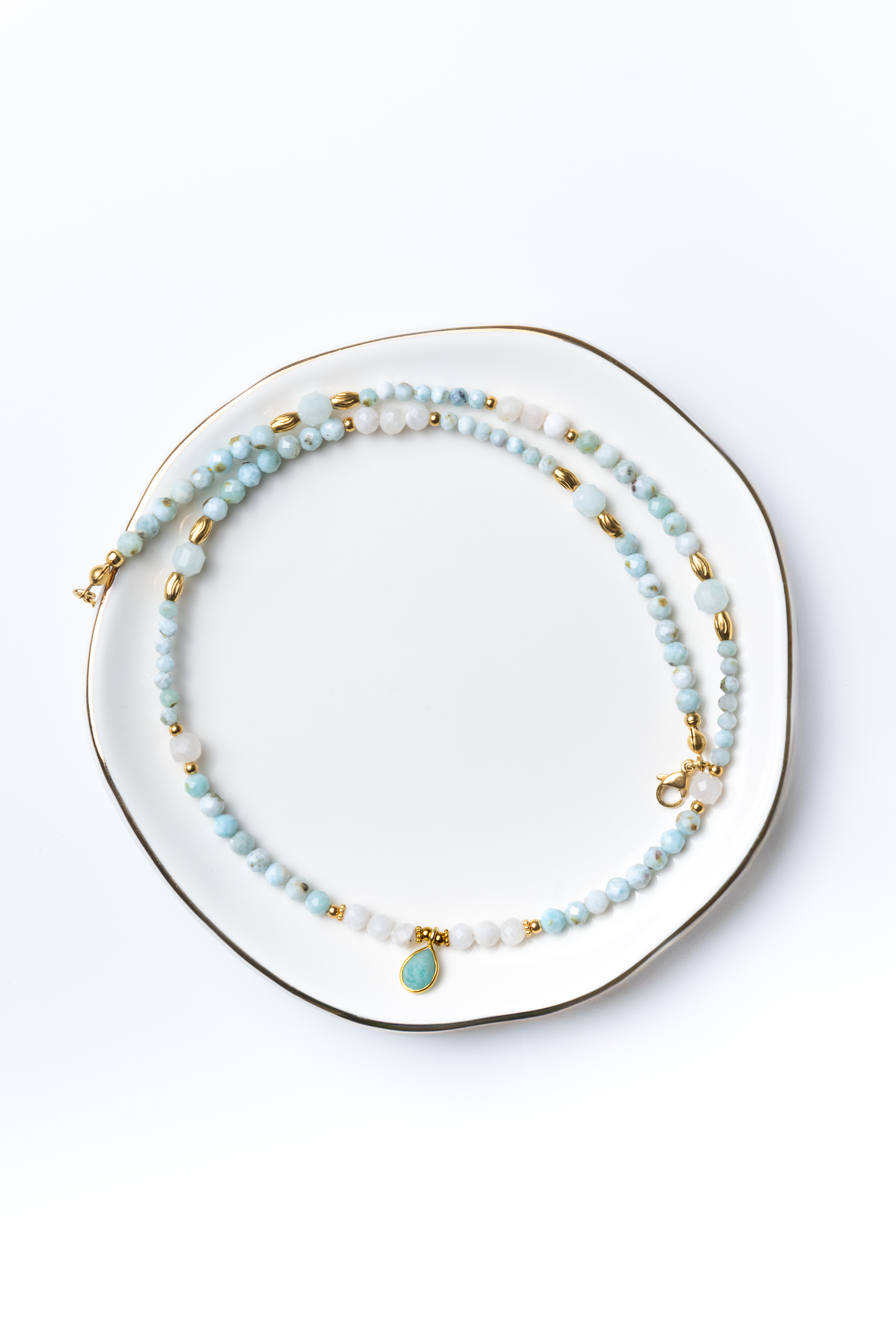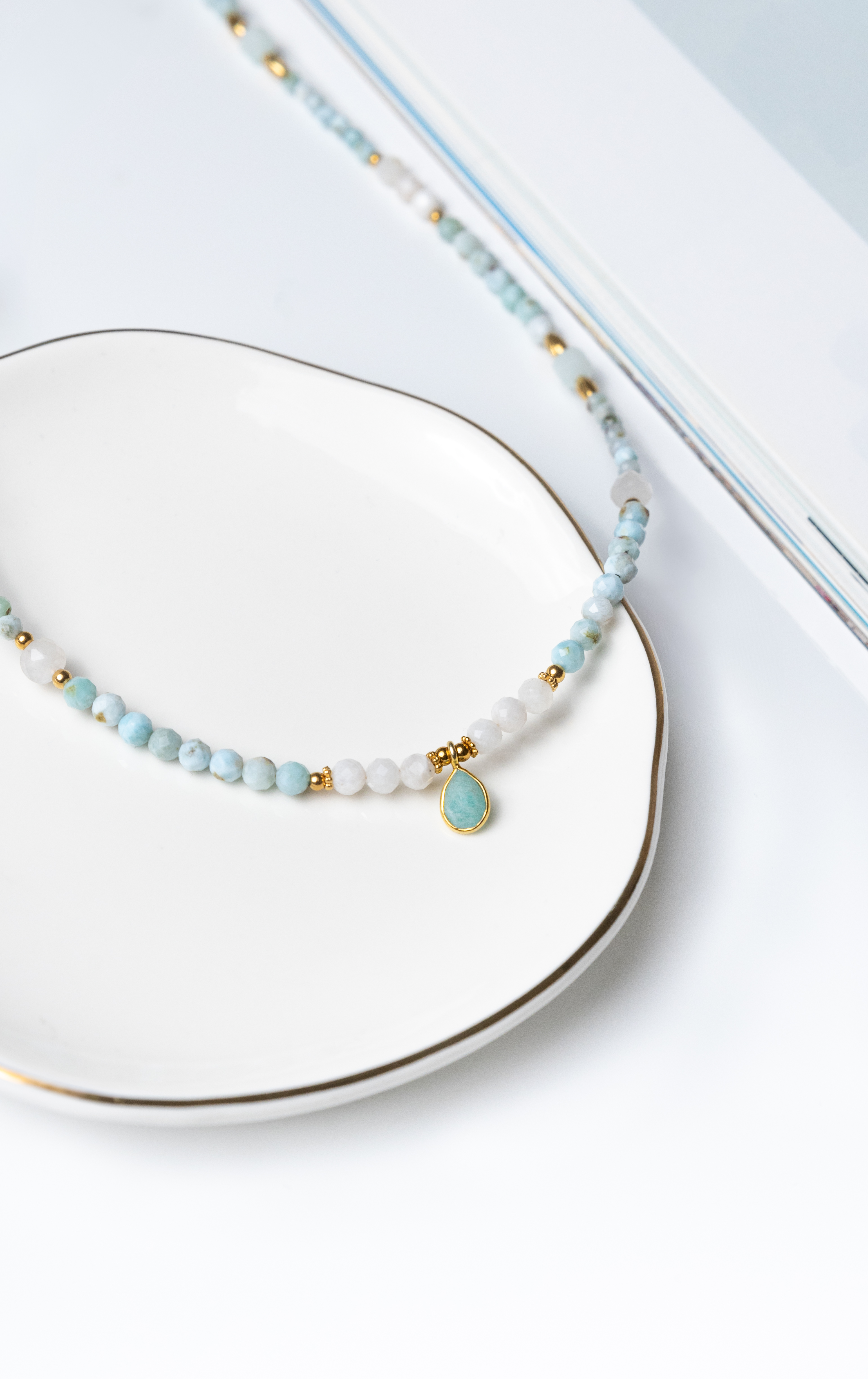 KAMIENIE: Larimar – spokój i komunikacja, Kamień księżycowy – intuicja, Amazonit – wyrażanie prawdy i emocji