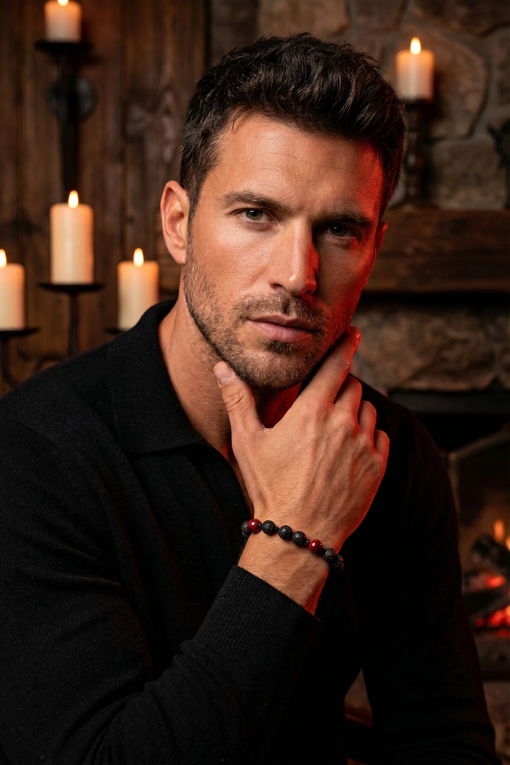 ŻYWIOŁ OGIEŃ – bransoletka męska z jaspisem czerwonym i lawą wulkaniczną